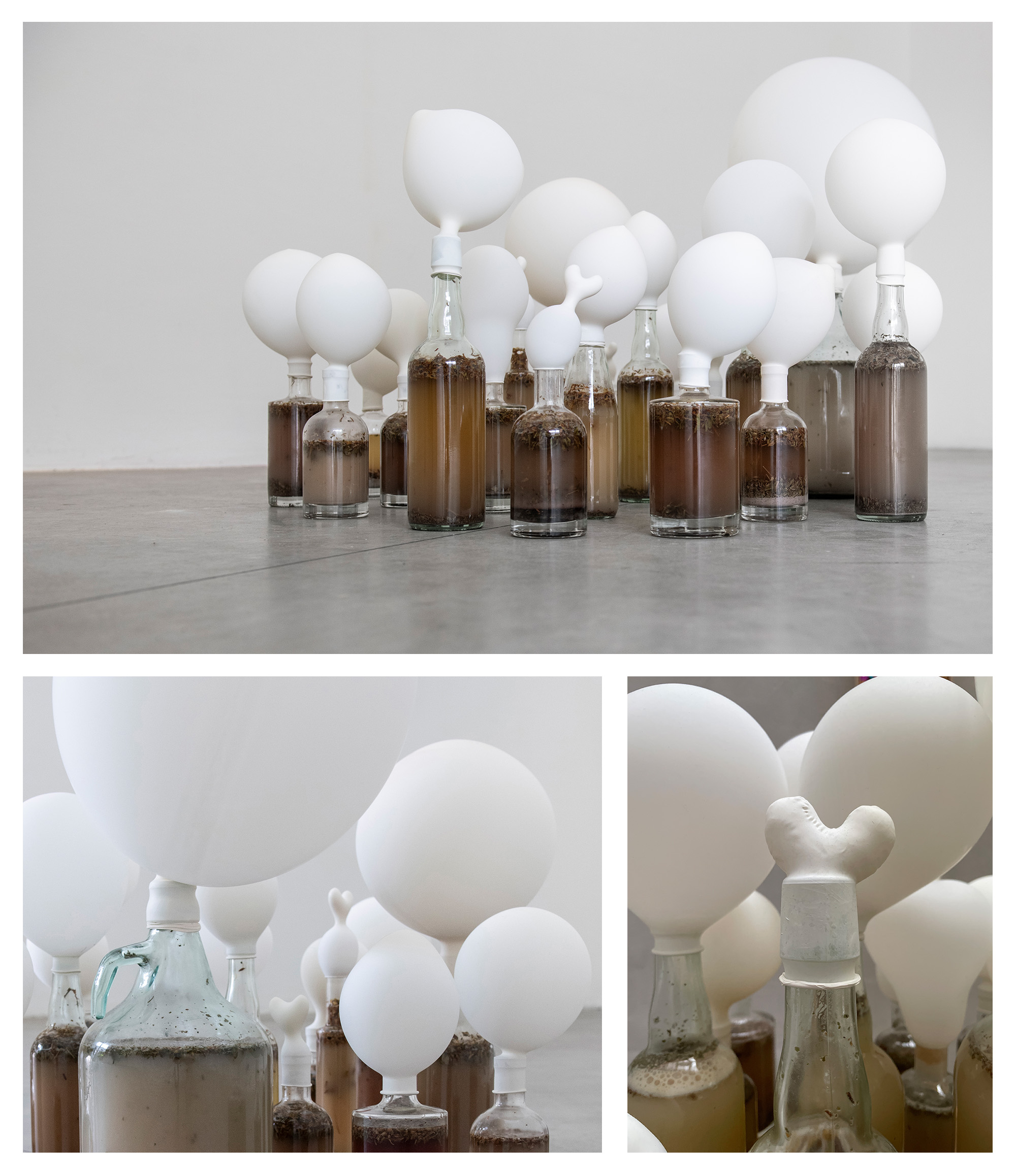 © Fotos: Margarethe Drexel. Good Spirits. In Transformation. (2022). Oben und unten links: 21 Glasflaschen Wasser, Echtes Johanniskraut, Hefe, Zucker, Honig; Maße variabel. Installationsansicht: Galleria Doris Ghetta, Mailand. Foto: Luca Meneghel. Unten rechts: 13 Glasflaschen, Wasser, Johanniskraut, Kräuter gesammelt in Krabach, Honig, Hefe, Zucker, Luftballons; Maße variabel.