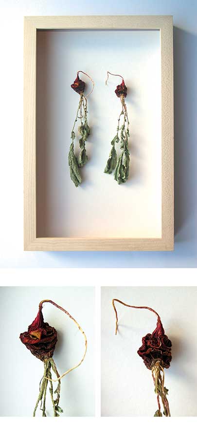 2 getrocknete, konservierte Radieschen, eines mit einem lachenden, eines mit einem weinenden Gesicht,